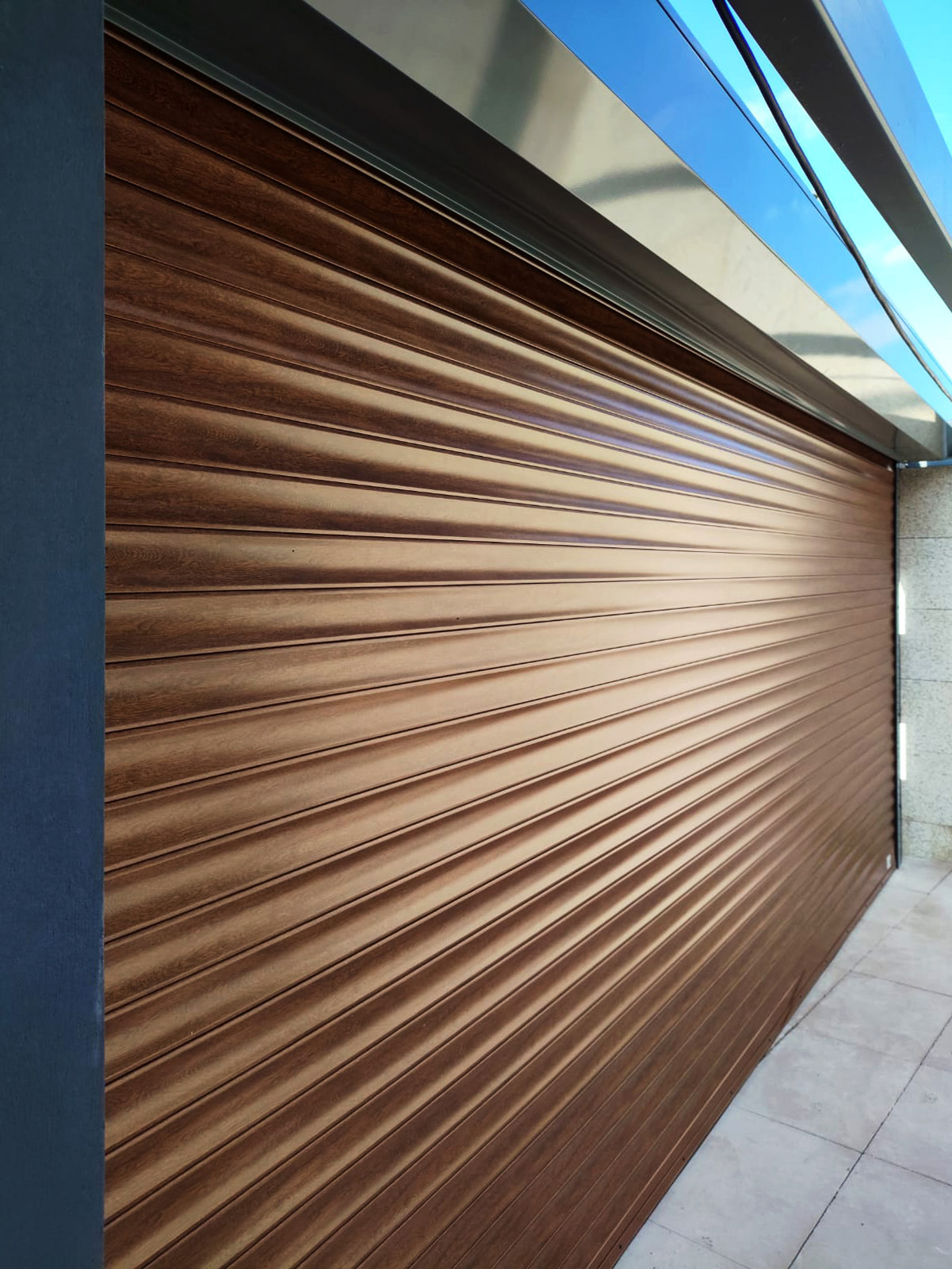 Lame incurvée en aluminium laminé remplie à l’intérieur de mousse de polyuréthane qui fournit à la porte une isolation thermique, acoustique et résistante.